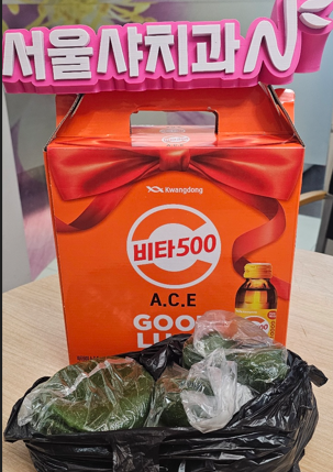 안녕하세요. 서울샤치과의원입니다. 환자분께서 선물해주신 쑥떡과 비타500 음료입니다.
